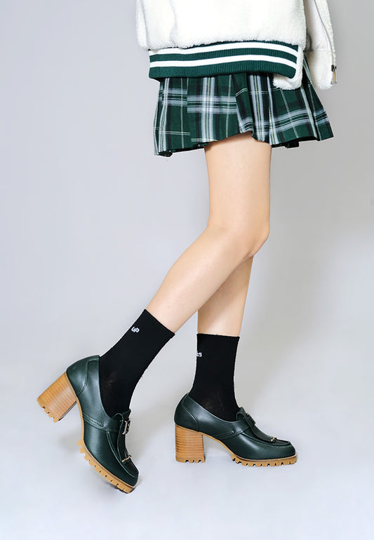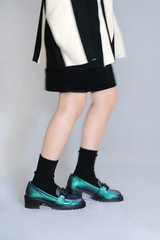 Elegant Green Leather Loafers with 7.5cm Chunky Heel