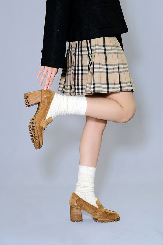 Elegant Brown Suede Loafers with 7.5cm Chunky Heel